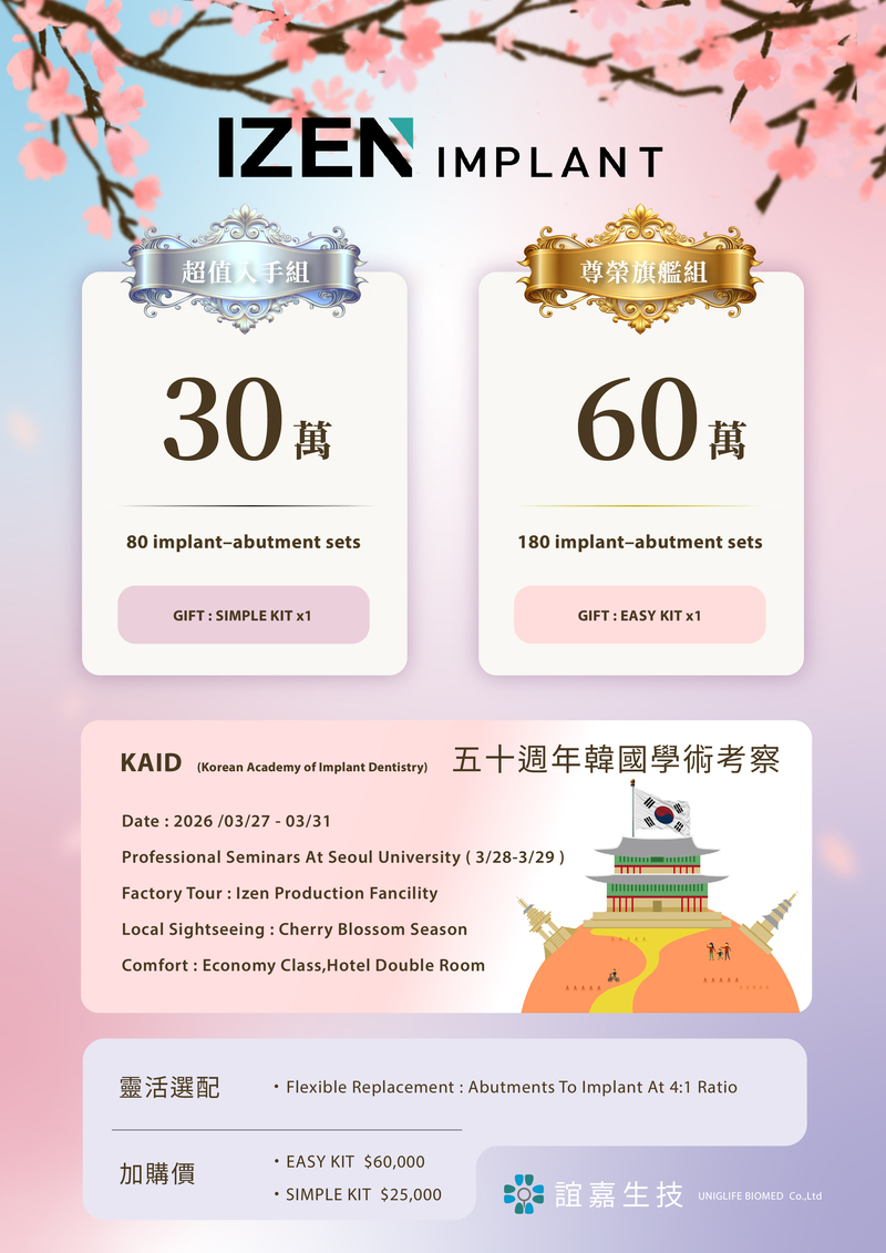 超值入手組30 萬植體 + 基台 80 組Simple Kit 1 組+ 韓國櫻花學術之旅 (1名)